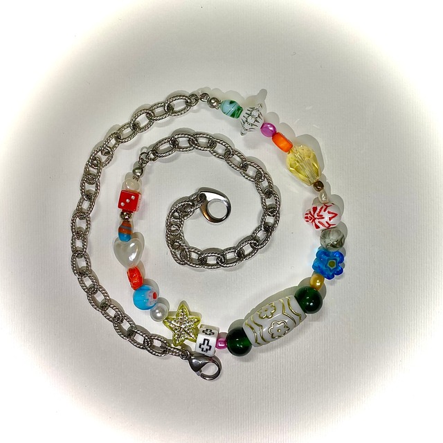 長さ: 約48cm (アジャスター無) 素材: ビーズ、ガラスビーズ、プラスティック等( ※チェーン部分は304ステレンレススチール素材) ※ステンレス鋼を採用しており、防錆性・耐久性に優れて、非常に頑丈で長持ちでき、汗や水により濡れても錆びたり汚れたりすることがありません。