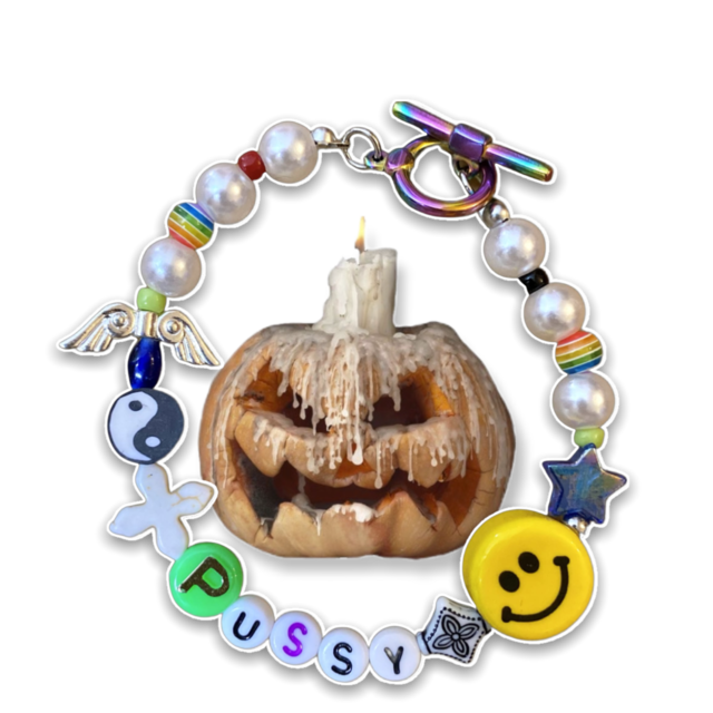 バット・ランゲージ・ビーズブレスレット " PUSSY " 長さ: 約16~18cm 素材: ガラスビーズ、ポリマークレイ、真鍮、陶器ビーズ、プラスティック等( ※エンドパーツの留め具のマンテル部分は304ステレンレススチール素材) ※ステンレス鋼を採用しており、防錆性・耐久性に優れて、非常に頑丈で長持ちでき、汗や水により濡れても錆びたり汚れたりすることがありません。