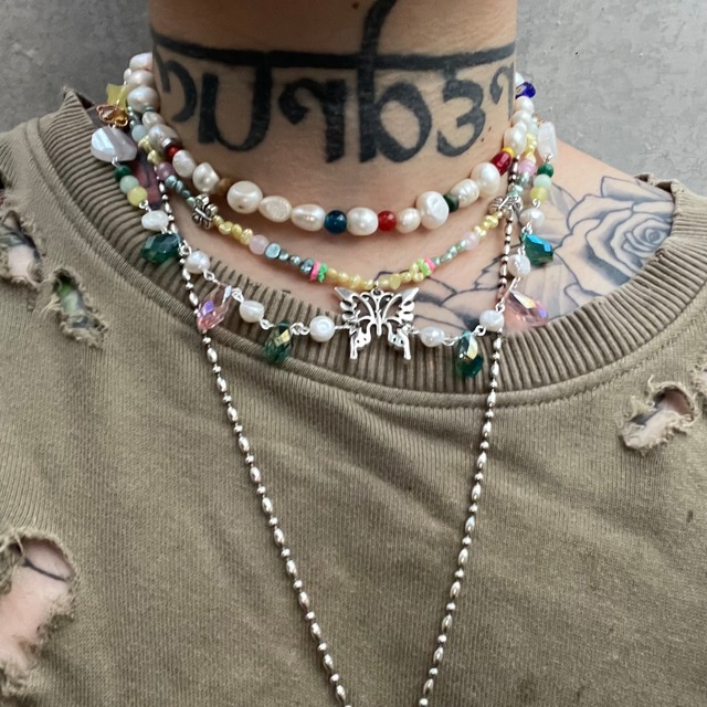 ジョリーンのシンボルとも言える蝶々マークをペンダント、裏肩にある星のアザをビーズに取り入れました。また彼女のスタイリッシュな服からグリーンカラー、髪色からイエロー、バタフライタトゥー、服のバタフライ刺繍から ピンクと水色を差し入れで投入。